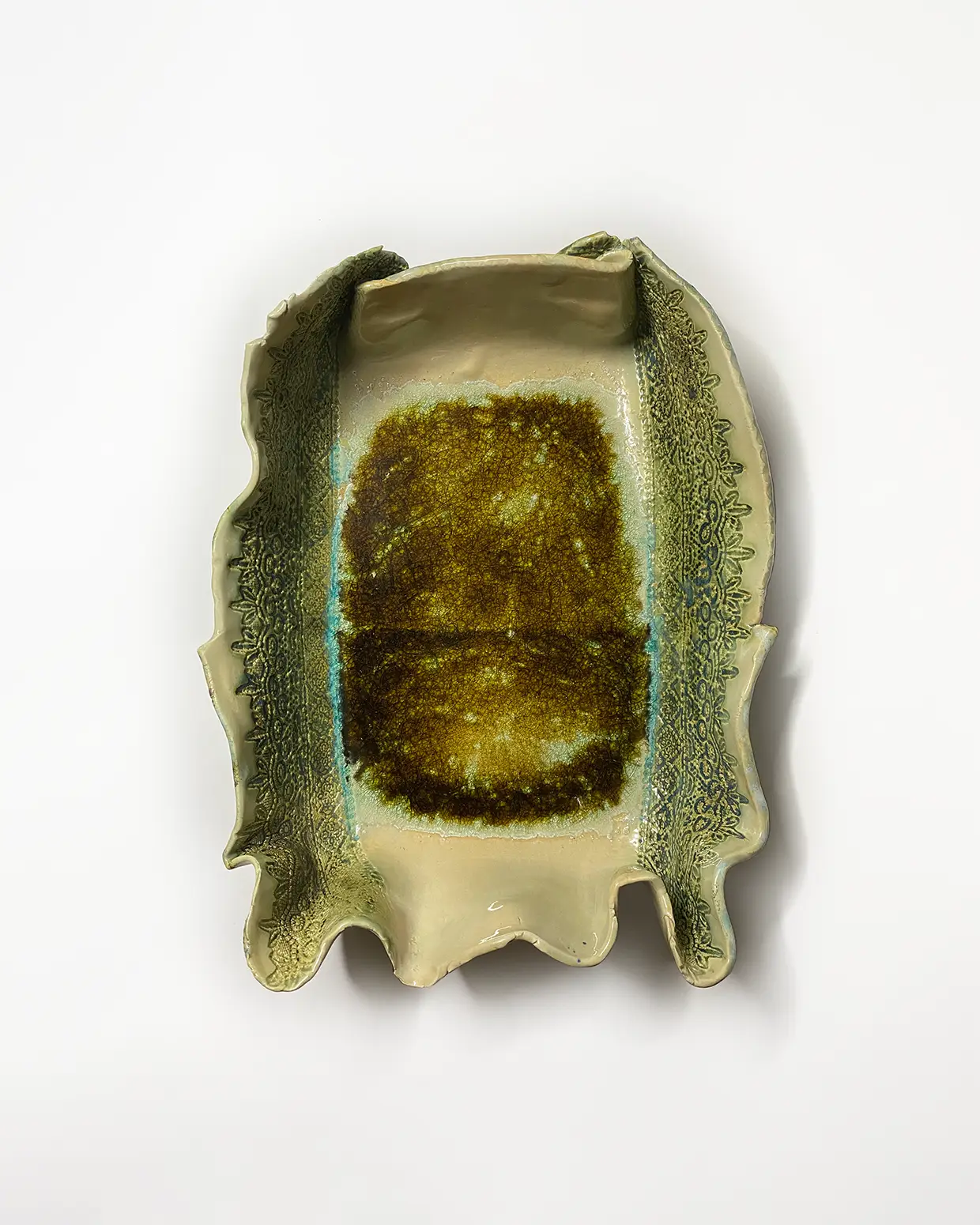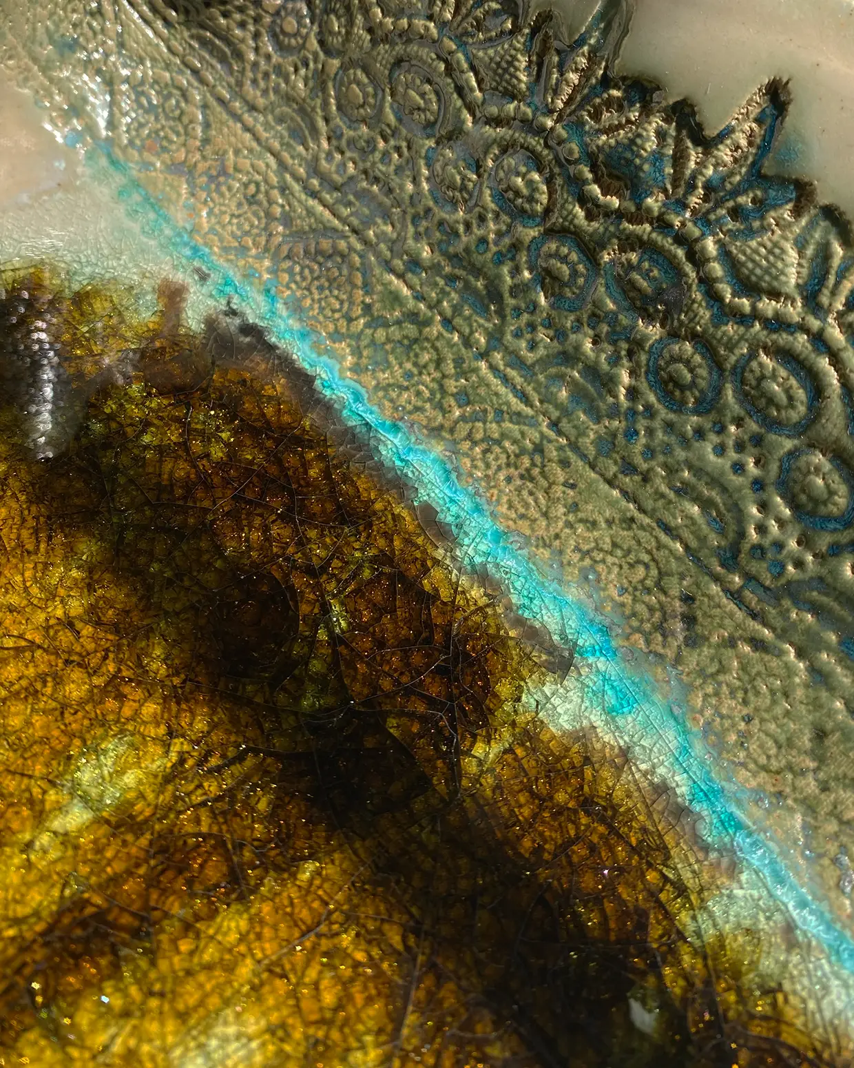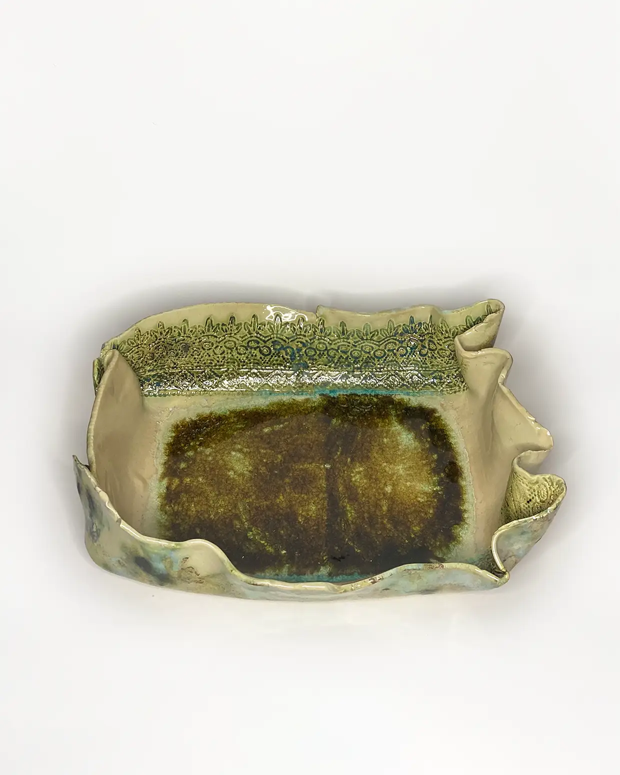Pieza de gran tamaño con decoración cardial en su parte externa 47/37/23cm en gres de alta temperatura 1280 grados, esmaltada en tonos verde turquesa satinado en su interior, La cerámica cardial es característica de uno de los primeros estadios del Neolítico de la cuenca mediterránea, durante los VI y V milenio a.C.