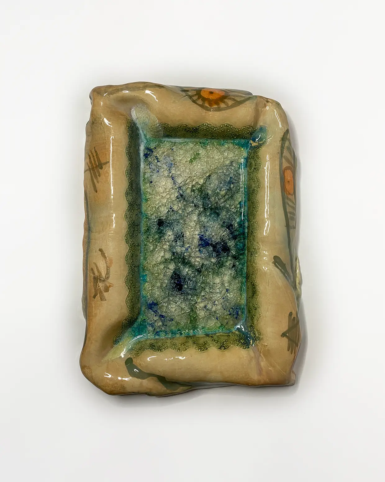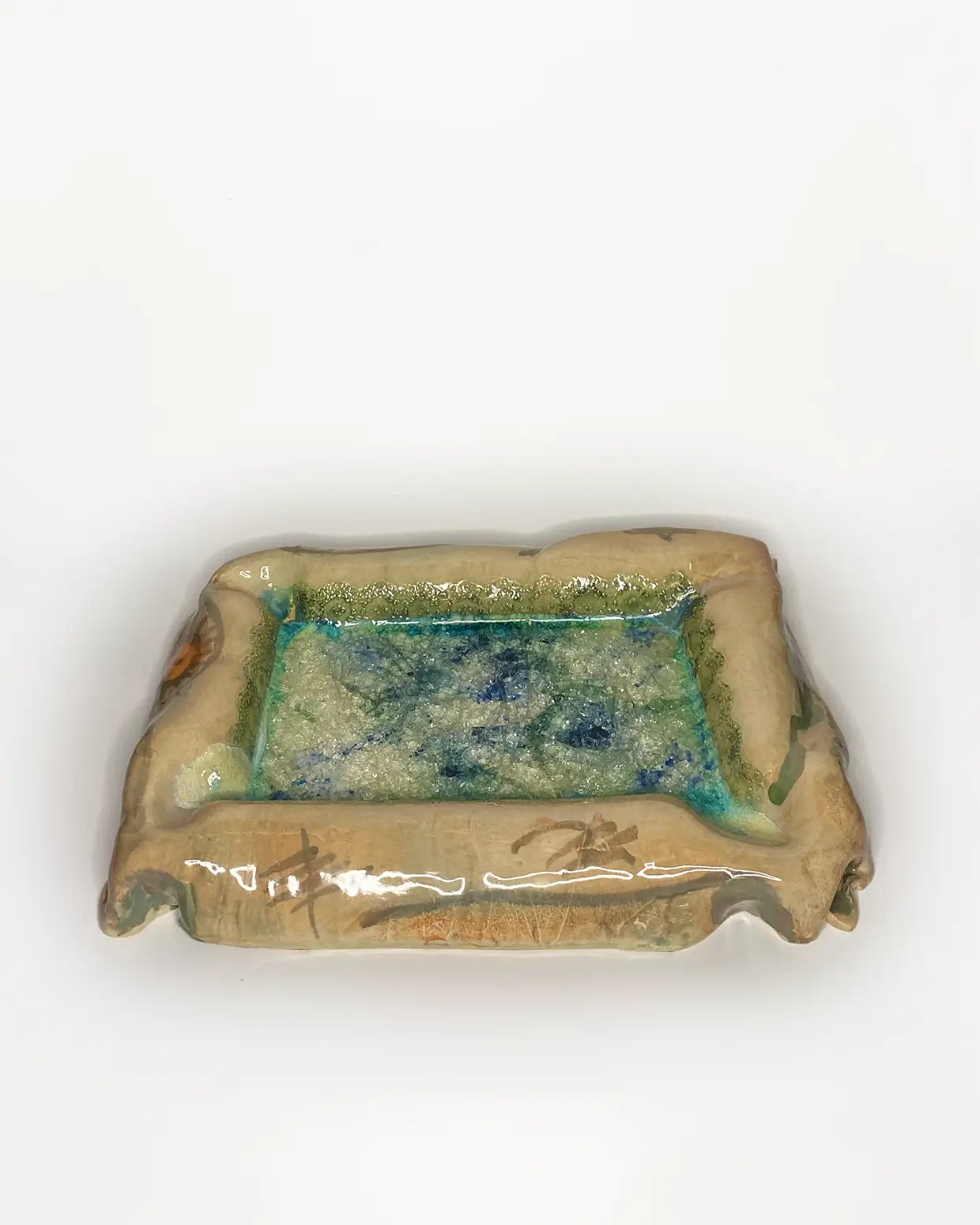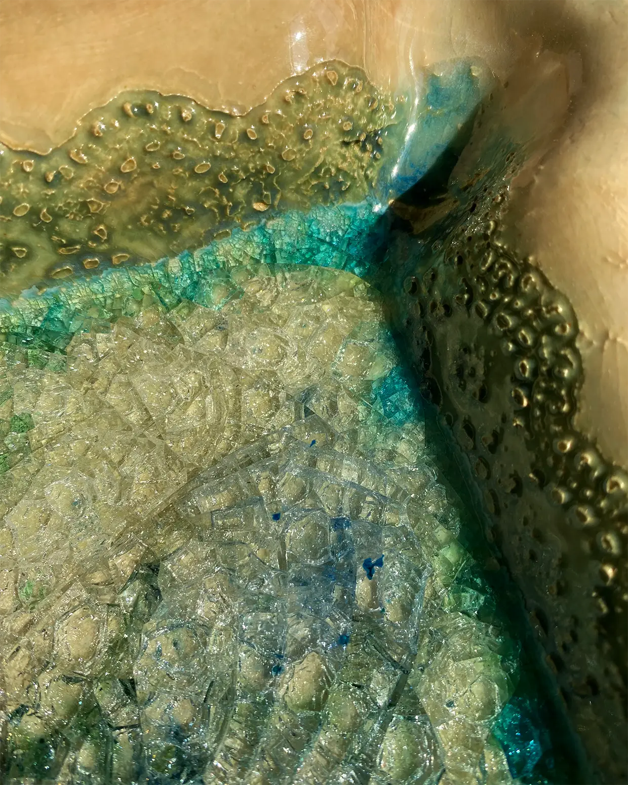 Pieza de gran tamaño con decoración cardial en su parte externa 47/37/23cm en gres de alta temperatura 1280 grados, esmaltada en tonos verde turquesa satinado en su interior, La cerámica cardial es característica de uno de los primeros estadios del Neolítico de la cuenca mediterránea, durante los VI y V milenio a.C.