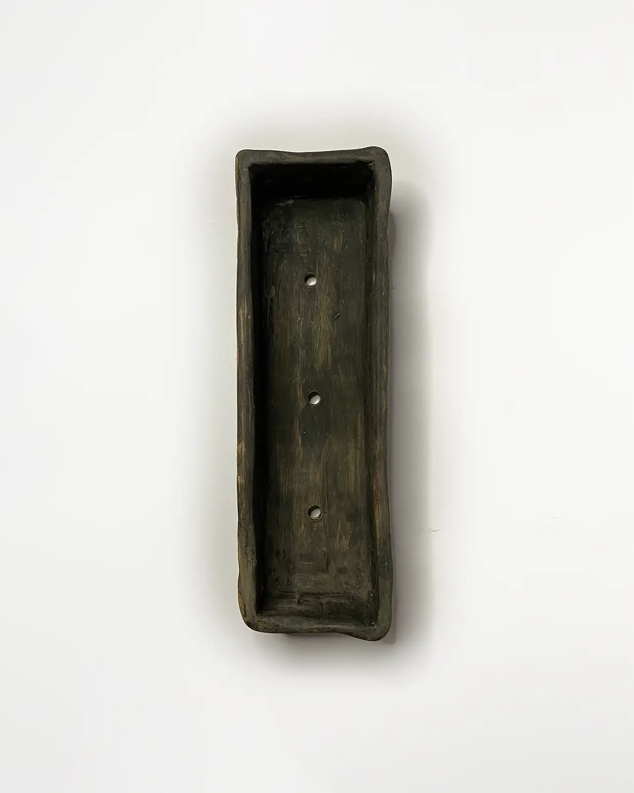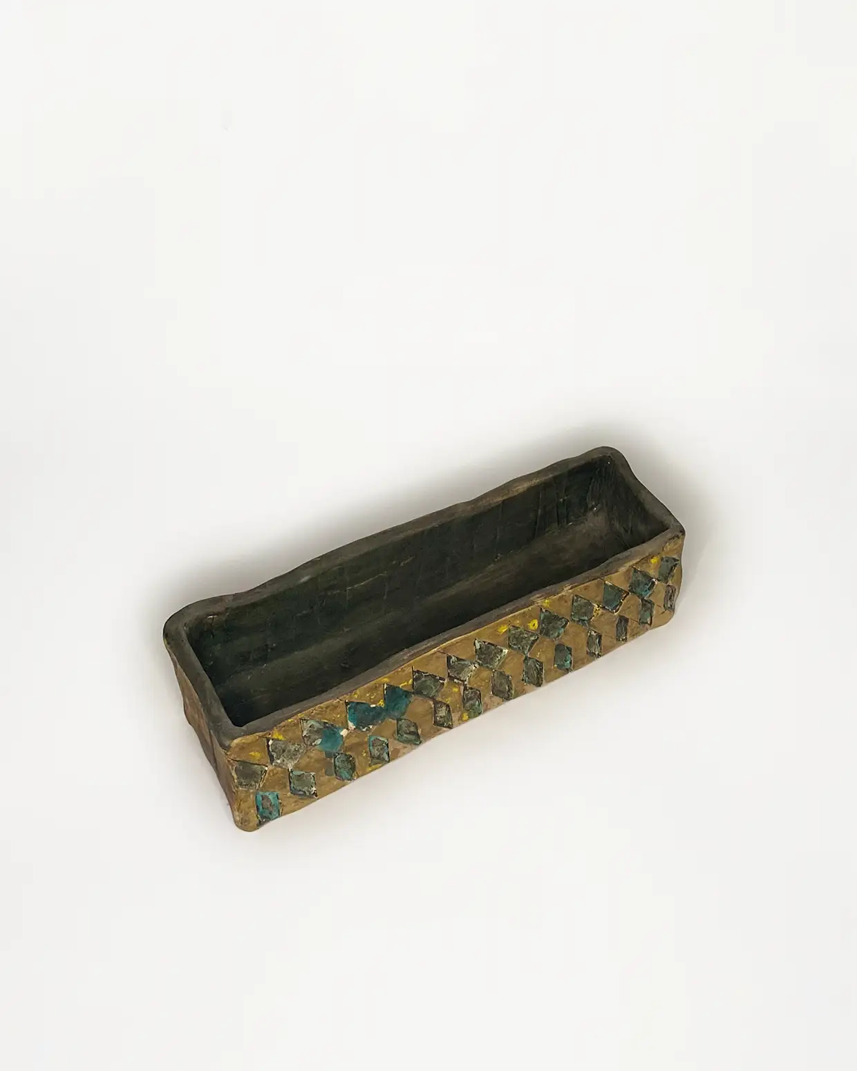 Pieza de gran tamaño con decoración cardial en su parte externa 47/37/23cm en gres de alta temperatura 1280 grados, esmaltada en tonos verde turquesa satinado en su interior, La cerámica cardial es característica de uno de los primeros estadios del Neolítico de la cuenca mediterránea, durante los VI y V milenio a.C.
