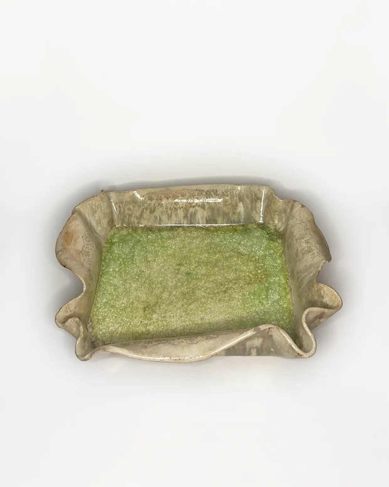 Pieza de gran tamaño con decoración cardial en su parte externa 47/37/23cm en gres de alta temperatura 1280 grados, esmaltada en tonos verde turquesa satinado en su interior, La cerámica cardial es característica de uno de los primeros estadios del Neolítico de la cuenca mediterránea, durante los VI y V milenio a.C.