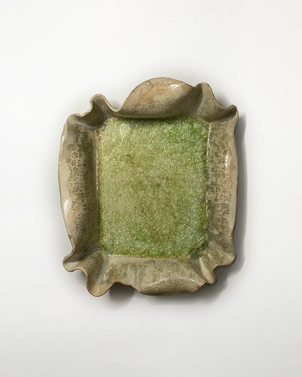 Pieza de alta temperatura 1280ºC. Gres esmaltado en su interior en verde turquesa con decoración cardial en su parte externa. 47-37/23cm